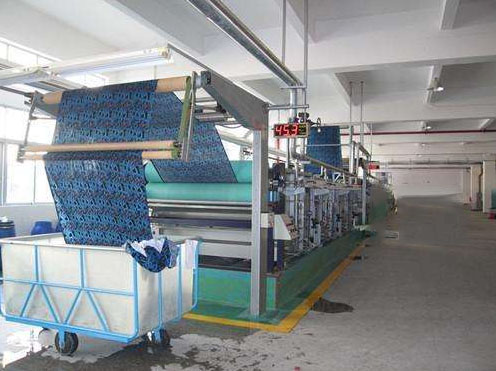 我們建議,在水洗中加一個用蒸汽燒熱水的容器,可以用蒸箱里蒸化時的蒸汽來加熱水,根據各地的水質硬度不同,在皂煮工藝上有一點不同。水質硬度大的地方在皂煮時要加入適量的軟水劑,否則就可出現第二污染,皂煮的污垢粘到面料上。污水做一個凈化池,凈后才有排放到河中。洗好的面料放在脫水機里脫水,脫水時放布一定要一層層,一圈放均勻,不能跑出脫水倉,注意安全,面料不要被機殼磨破。如果客戶有特殊需要,加柔軟劑,固色劑都可以在這里一步來做。