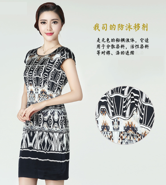 我司的防泳移劑是無色的粘稠液體,它適用于分散染料,活性染料等對棉、滌的連續軋染,能夠有效地阻止染料在烘干過程的泳移。它還能夠跟染色用的陰非離子助劑配合適用,不會影響染色的性能,它還對染浴的粘度會有所加強,讓染浴更加的穩定,而且水溶性也好,可以用水沖洗清除。