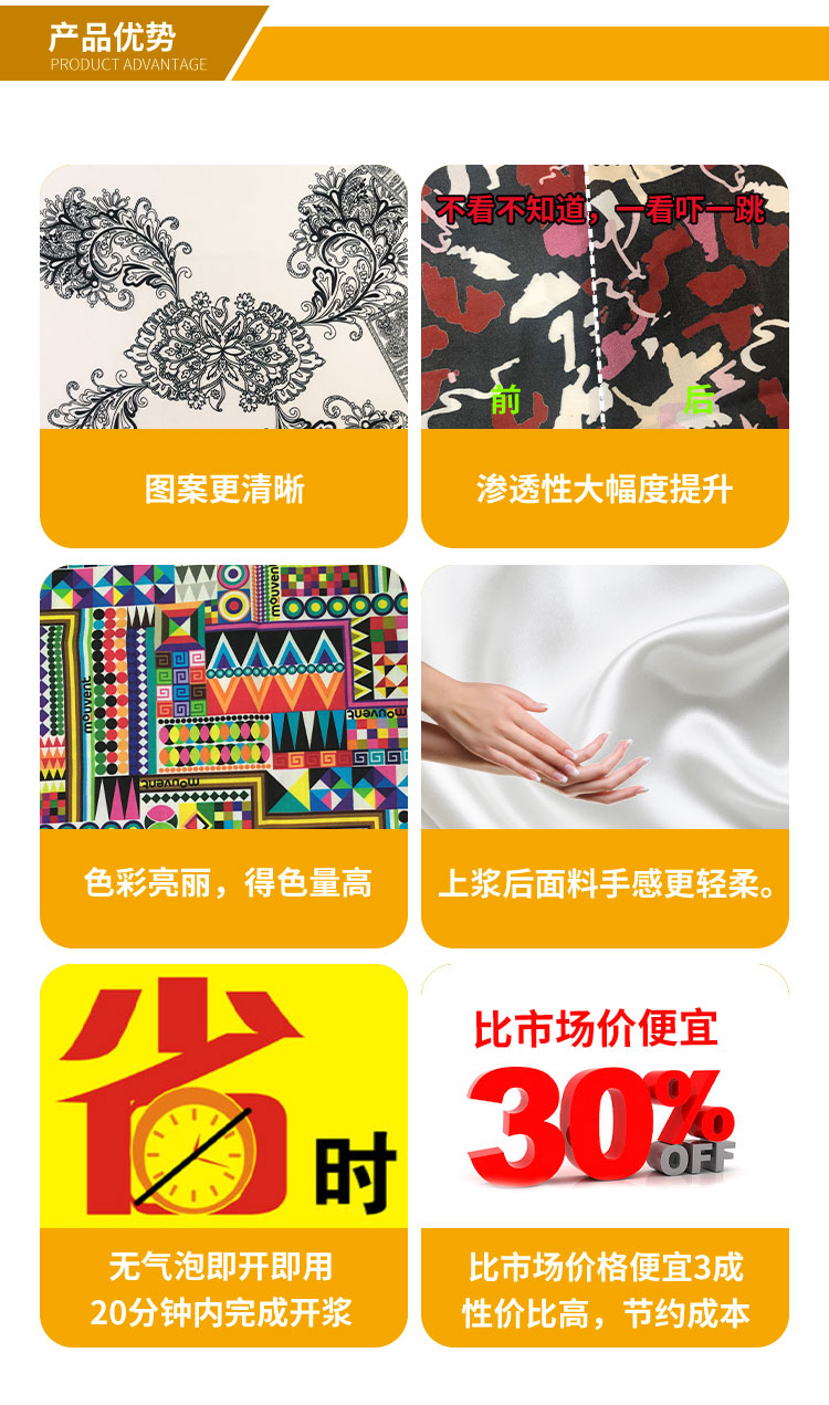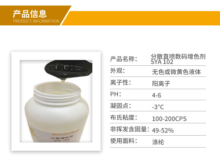 分散數碼印花增色劑SYA102 溶于水,能輕易的通過水性溶液從布料上移除,所以不會殘留在噴墨以及干燥過程中。