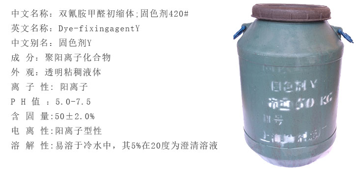 固色劑Y穩定性: 遇硬水、強酸、強堿、丹寧酸、雕白塊以及大量硫酸鹽,次氯酸鹽等會產生沉淀。