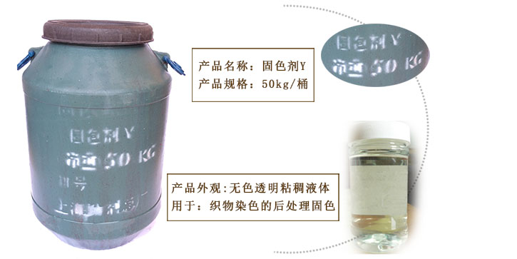 固色劑Y混用性: 可與非電離、陽離子表面活性劑或陽離子合成樹脂初縮體混合使用,不可與陰離子型染料,陰離子表面活性劑混用。