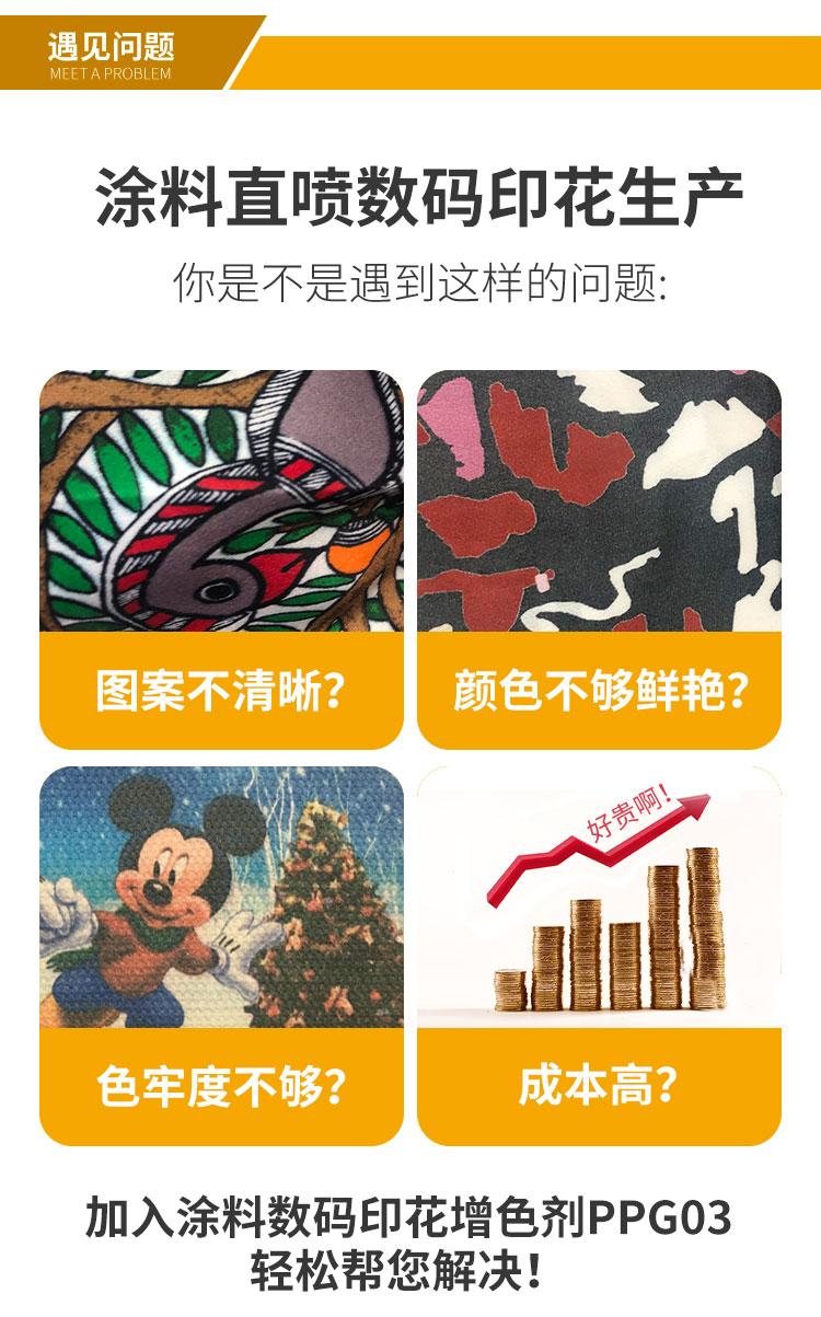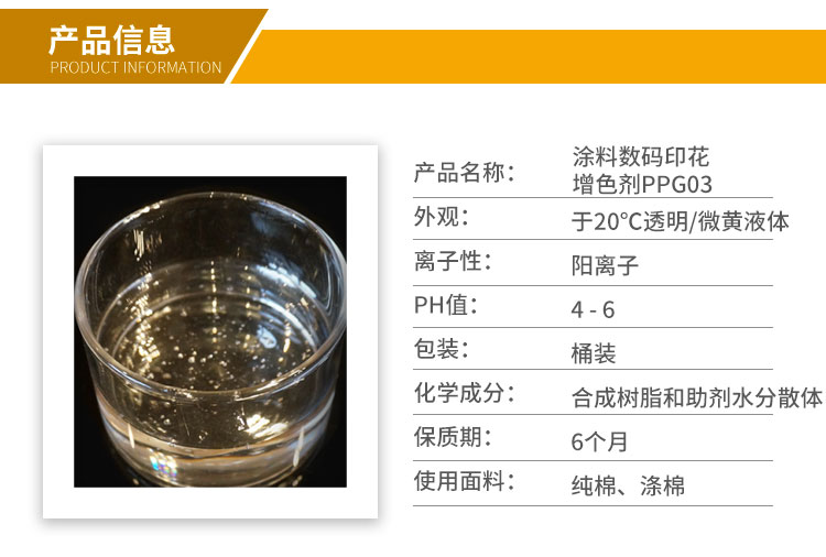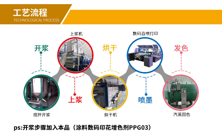 涂料數碼印花增色劑PPG03使用浸軋于面料上。用量 100- 180 克/升