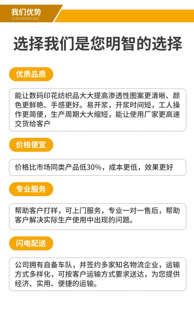 涂料數碼印花增色劑PPG03說明:本資料是根據本公司現有的技術知識和經驗編寫的。由于在加工和應用本公司產品的過程中有許多影響因素,因此不排除用戶自行試驗的必要性。