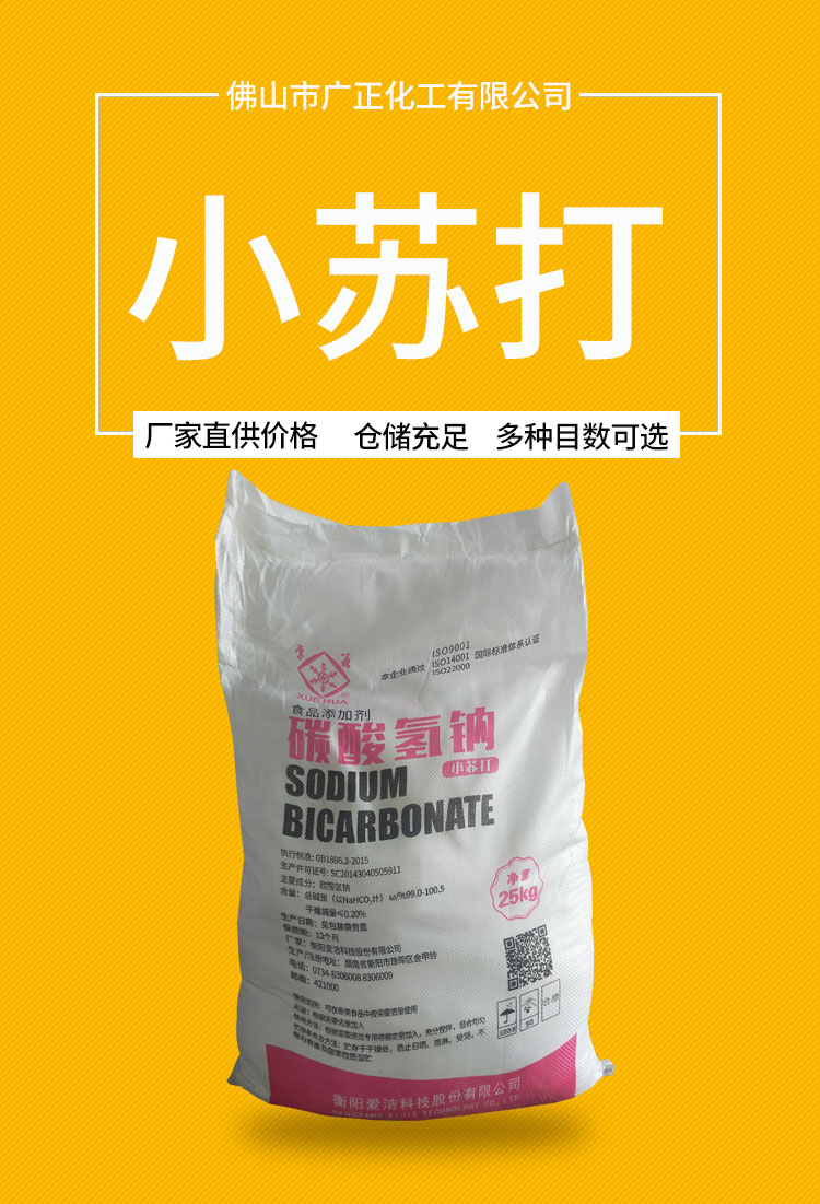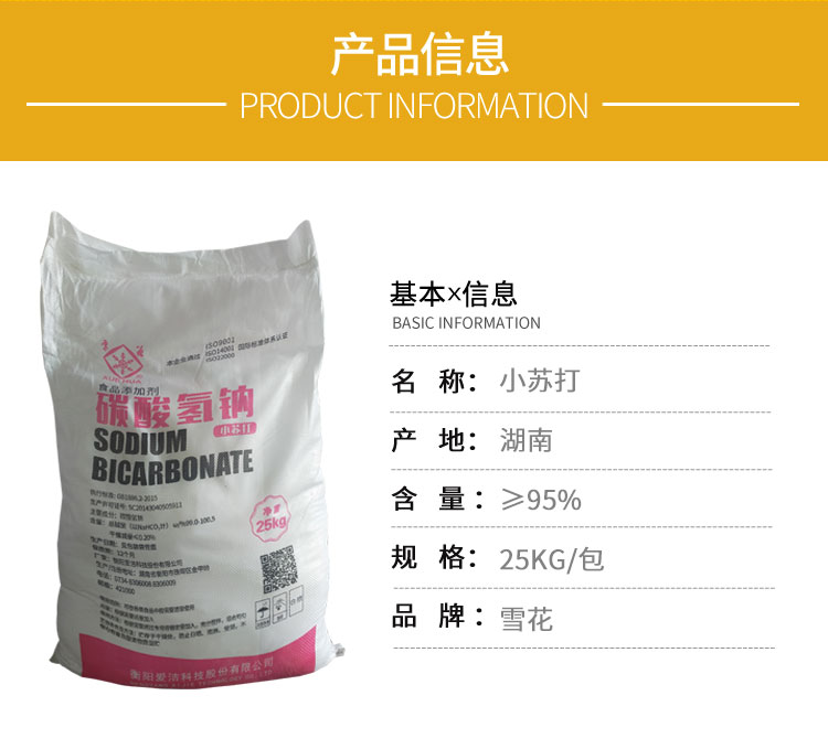 雪花食品級小蘇打的化學名稱叫碳酸氫鈉,經常用它當發酵粉做饅頭、餅干等食品添加劑。食品級小蘇打主要用于食品、飲料汽水和冷飲中二氧化碳的發生劑。