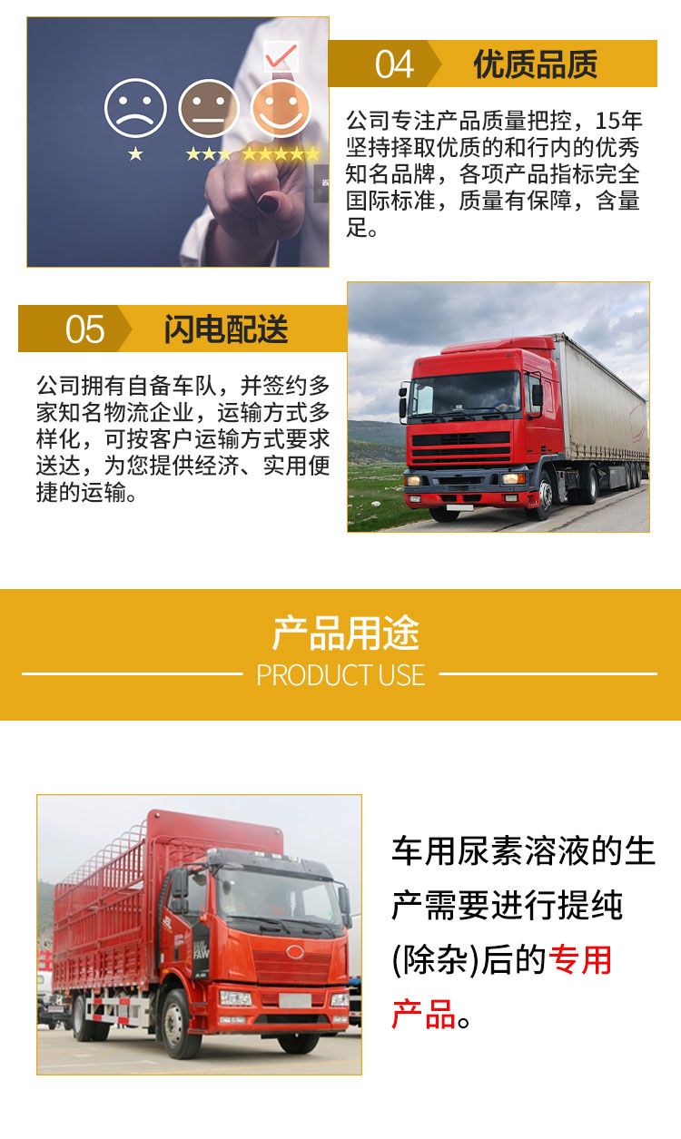 心連心車用尿素原料,是心連心公司農業尿素的升級產品。是在農業尿素生產線的基礎上專門針對車用尿素溶液的生產需要進行提純(除雜)后的專用產品。用心連心車用尿素原料生產車用尿素溶液,無需其他的提純過程,只需將原料和超純水按照1:2的比例配制、溶解和過濾即可,所得產品可同時滿足國際、國家標準的指標要求。